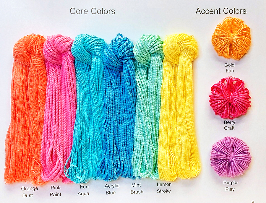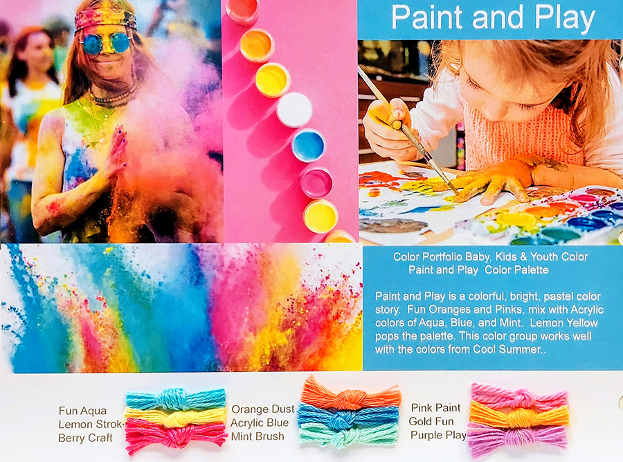 -8 merchandised color groups, 9 colors per color group for a total of 72 colors in this book. All colors are presented in generously dyed yarn skeins.